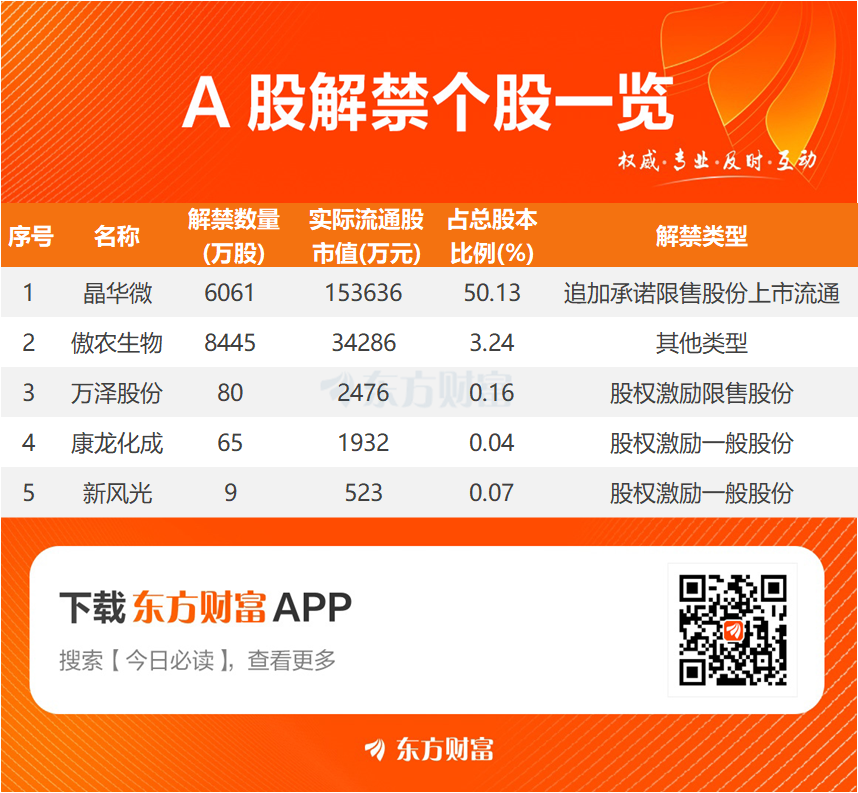 【明日解禁】明日5股解禁 晶华微、傲农生物解禁市值居前