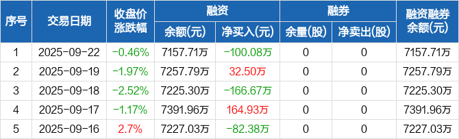 近岸蛋白:融资净偿还100.08万元,融资余额7157.71万元(09-22)