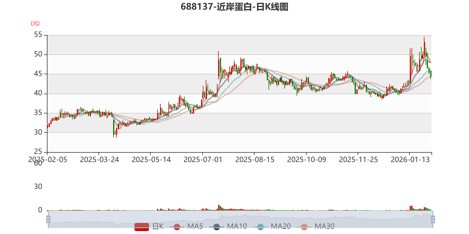 中证智能财讯近岸蛋白(688137)1月30日晚间披露2025年度业绩预告,预计2025年归母净利润亏损6600万元至8500万元,上年同期亏损5441.63万元;扣非净利润亏损6500万元至8400万元,上年同期亏损7174.86万元。以最新收盘价计算,市净率(LF)约1.5倍,市销率(TTM)约21.12倍。