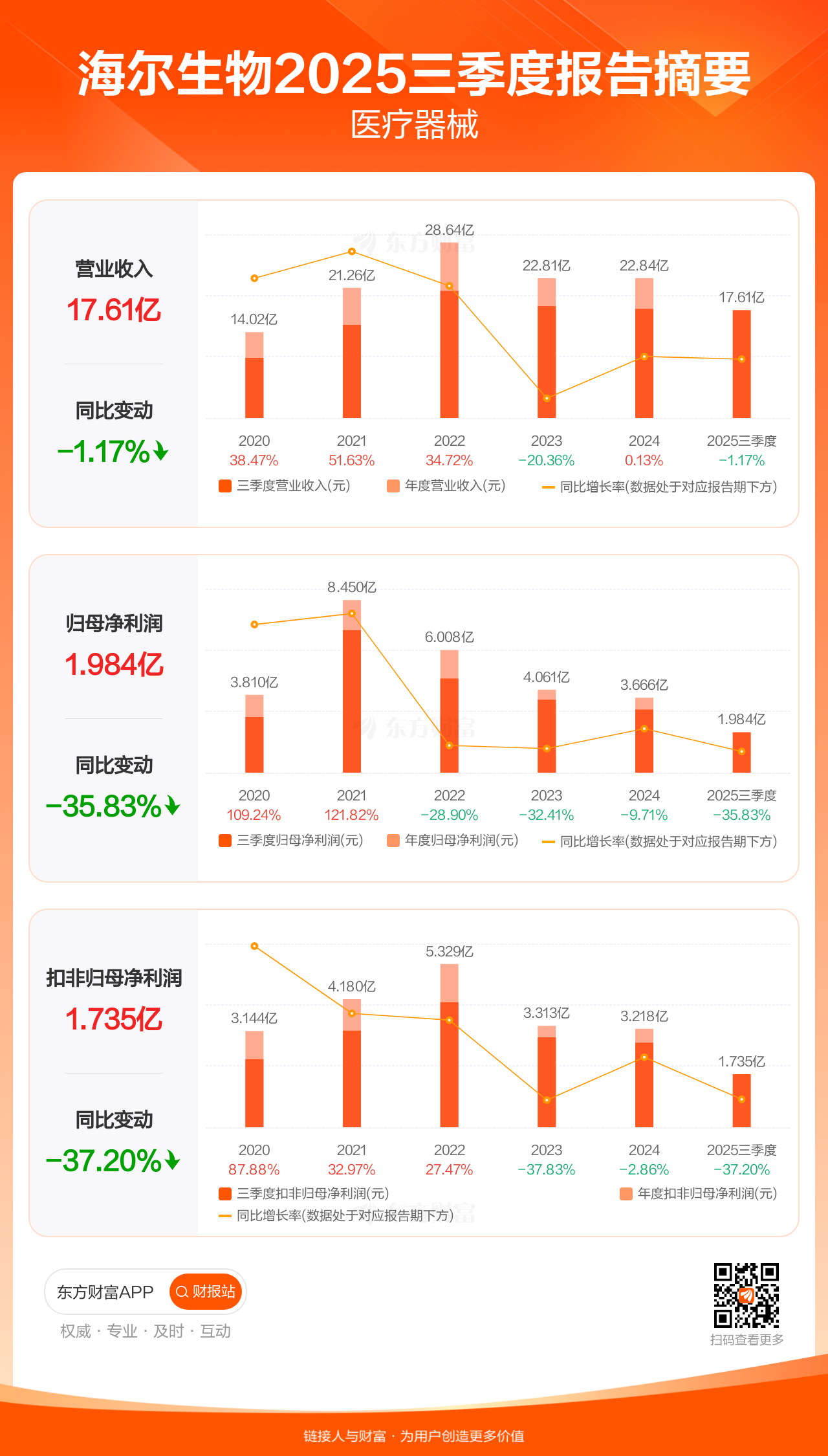 海尔生物10月31日发布2025年三季报显示,公司前三季实现营业收入17.61亿元,同比下滑1.17%;归母净利润1.98亿元,同比下滑35.83%;扣非归母净利润1.73亿元,同比下滑37.20%。