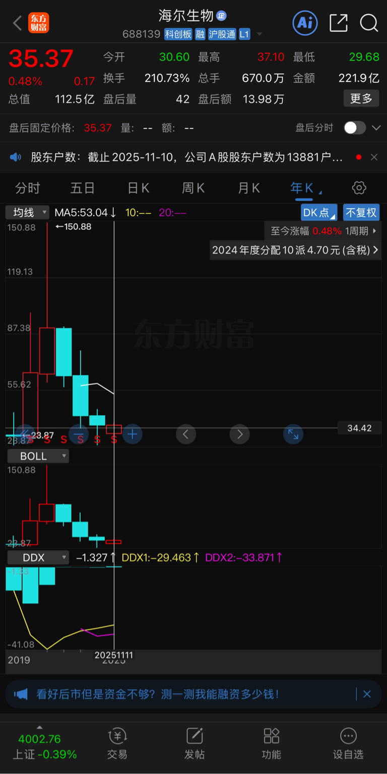 截至公元2025年11月11日沪股指4000点,海尔生物收盘价35.37元,年度