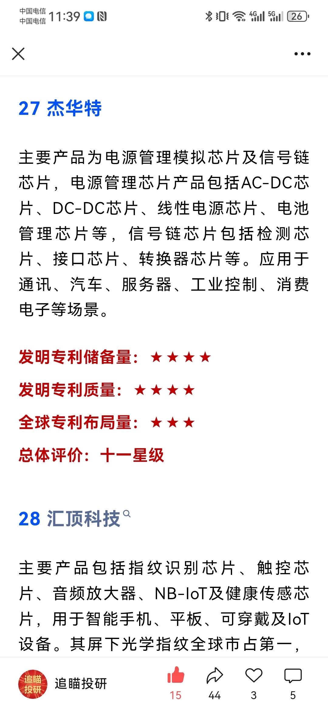9月15日分析28家模拟芯片公司的专利创新实力,杰华特综合排名第二,可惜没入手,