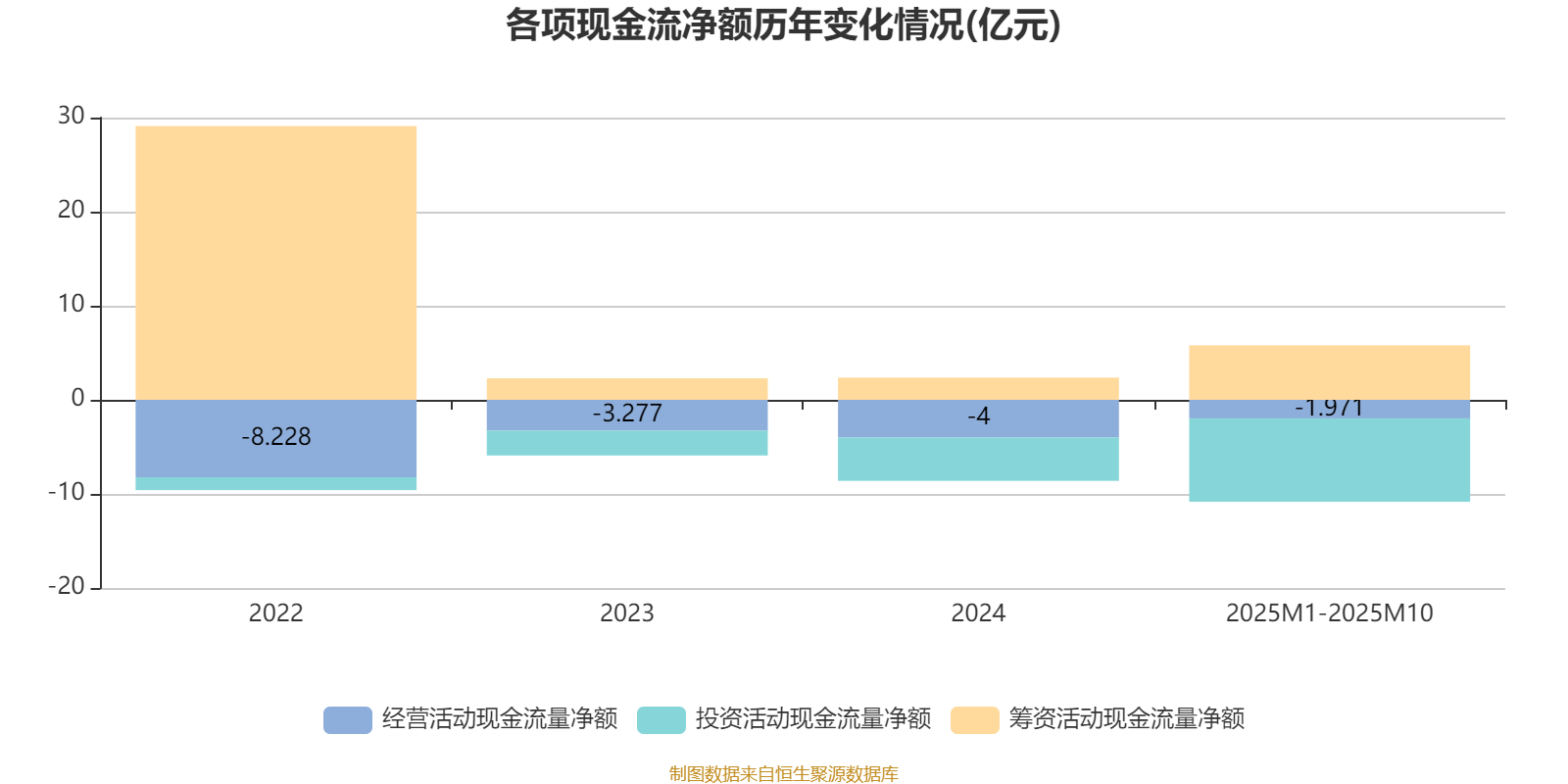 2025年1月至10月,公司经营活动现金流净额为-1.97亿元,同比增加1.37亿元;筹资活动现金流净额5.79亿元,同比增加3.6亿元;投资活动现金流净额-8.86亿元,上年同期为-3.94亿元。