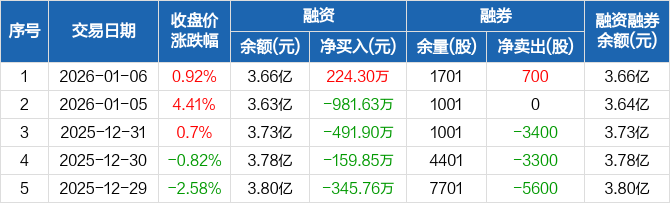 中船特气:融资净买入224.3万元,融资余额3.66亿元(01-06)
