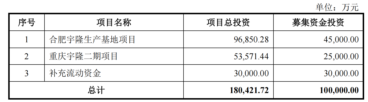 公司本次募集资金拟投向合肥宇隆生产基地项目、重庆宇隆二期项目以及补充流动资金项目,总计拟募资10亿元,其中3亿元用于补流。前次冲击上市,宇隆科技同样是拟补流3亿元。