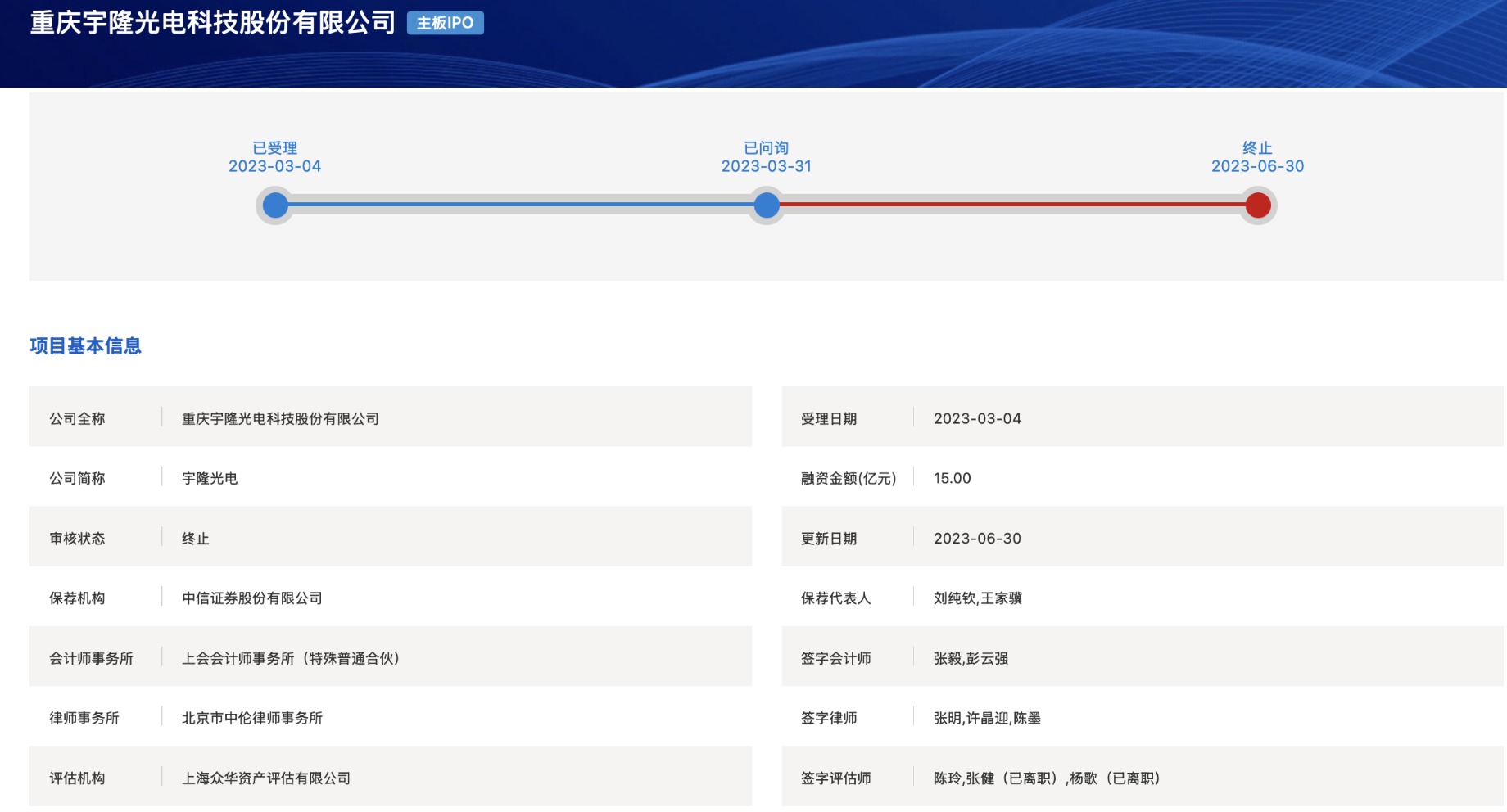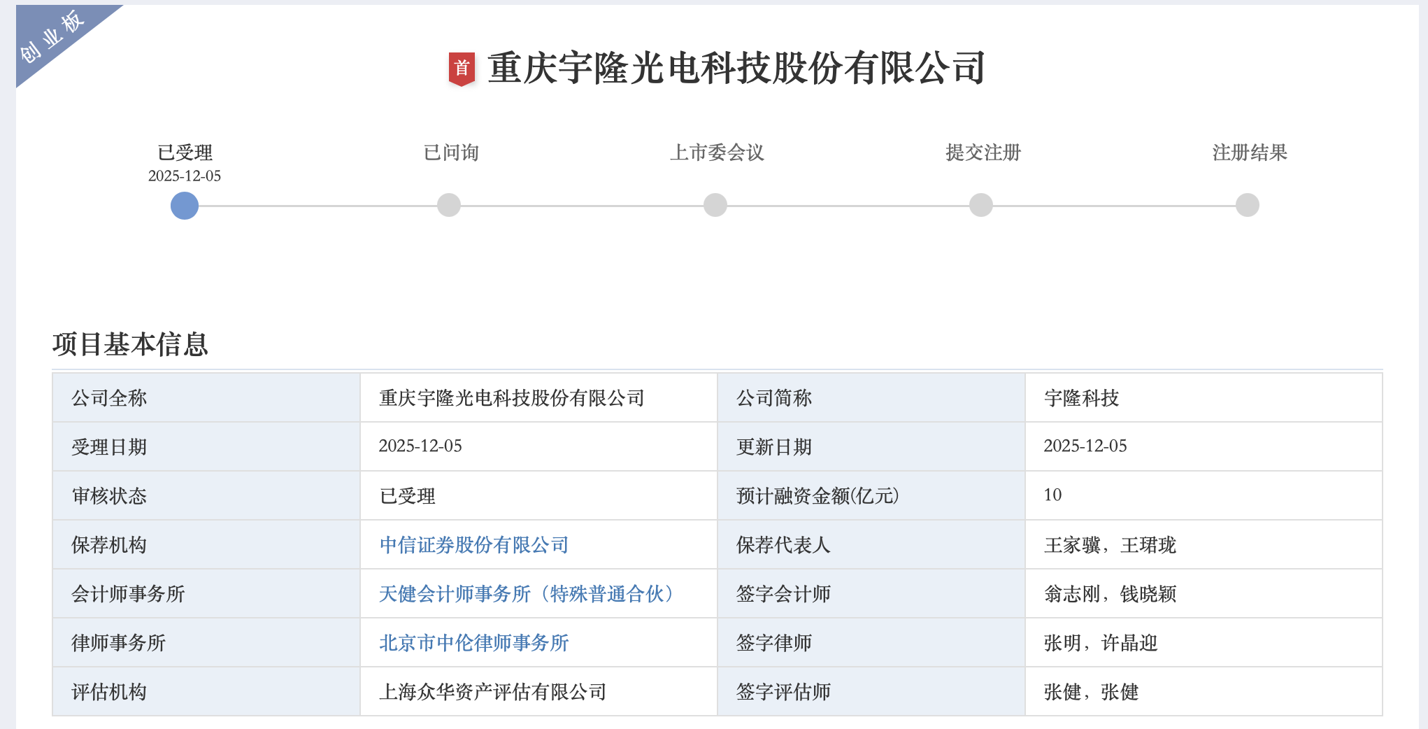 12月5日,深交所官网显示,重庆宇隆光电科技股份有限公司(简称“宇隆科技”)创业板IPO获得受理,中信证券为其保荐机构。