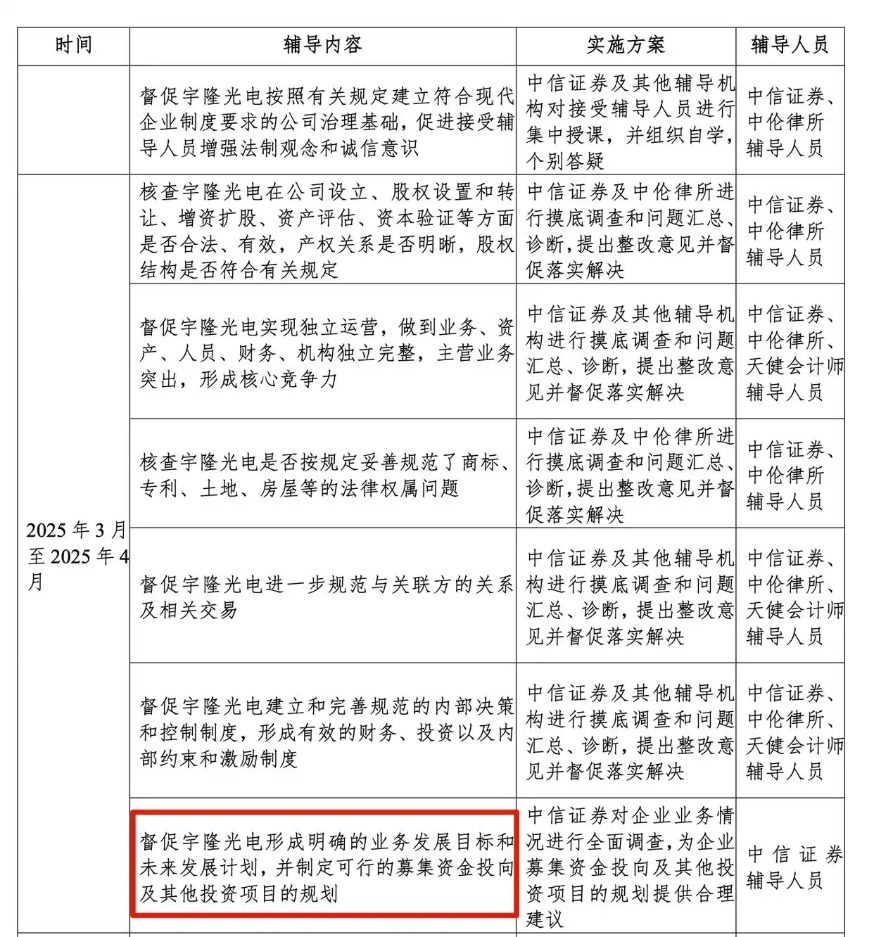 中信证券在此前与宇隆光电签署的辅导备案报告中表示,督促宇隆光电形成明确的业务发展目标和未来发展计划,并制定可行的募集资金投向及其他投资项目的规划。