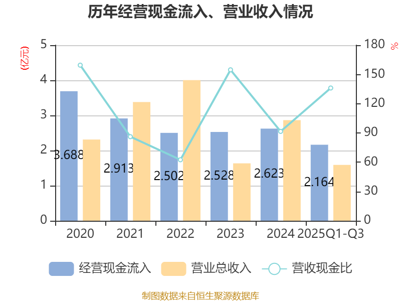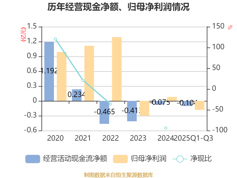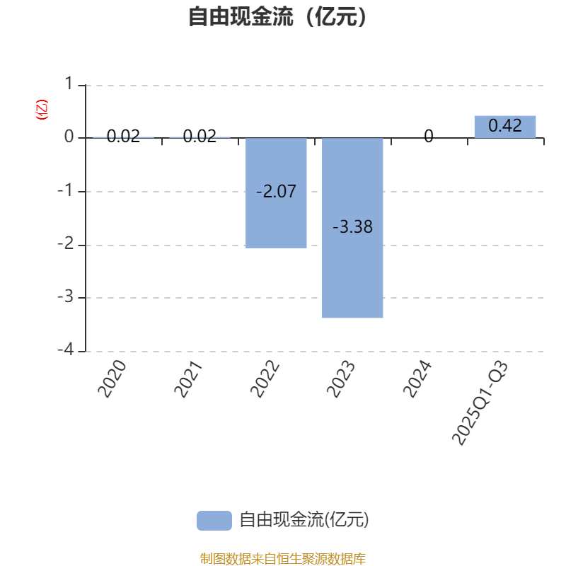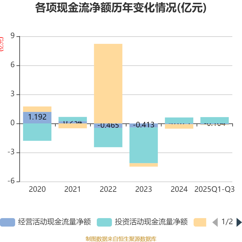 2025年前三季度,公司经营活动现金流净额为-1043.99万元,同比增加2219.51万元;筹资活动现金流净额-592.14万元,同比增加3776.2万元;投资活动现金流净额6528.28万元,上年同期为8981.37万元。