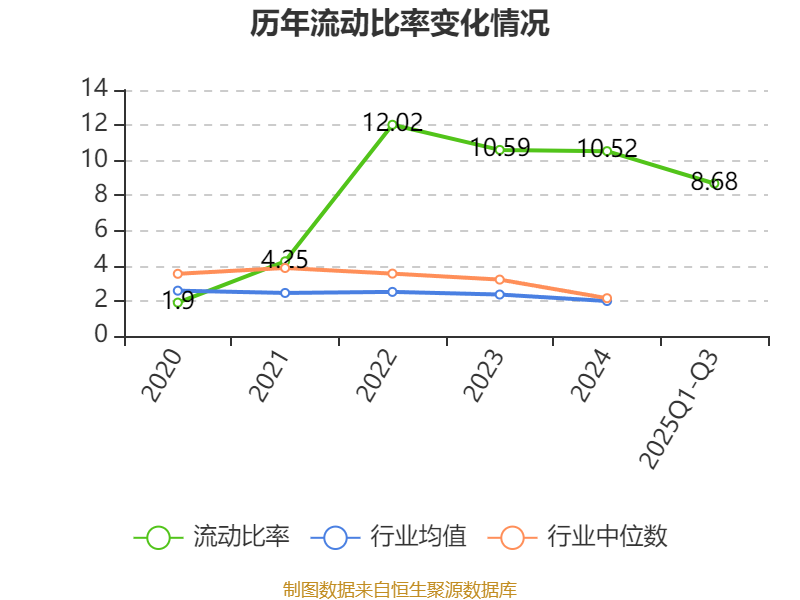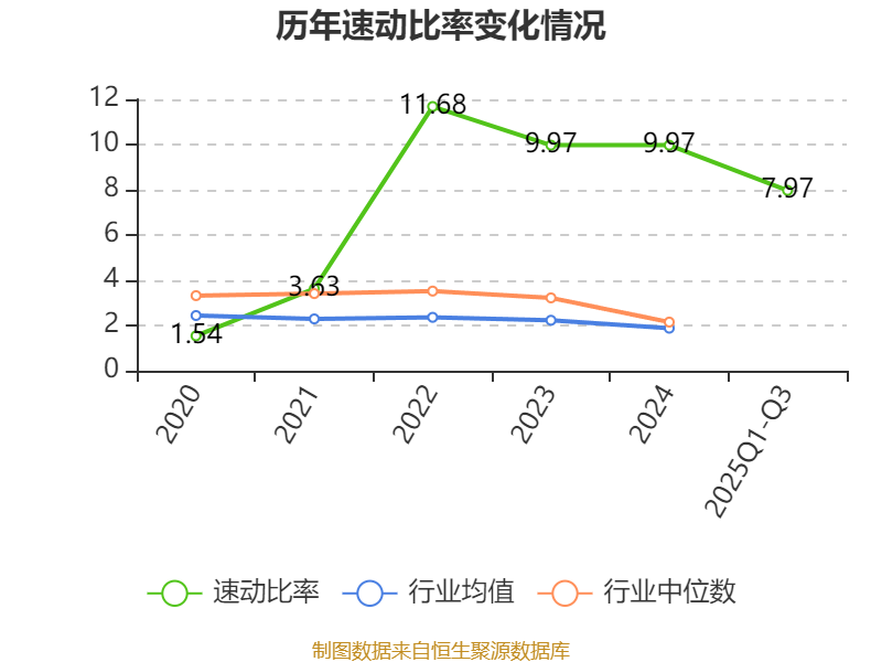 2025年前三季度,公司流动比率为8.68,速动比率为7.97。