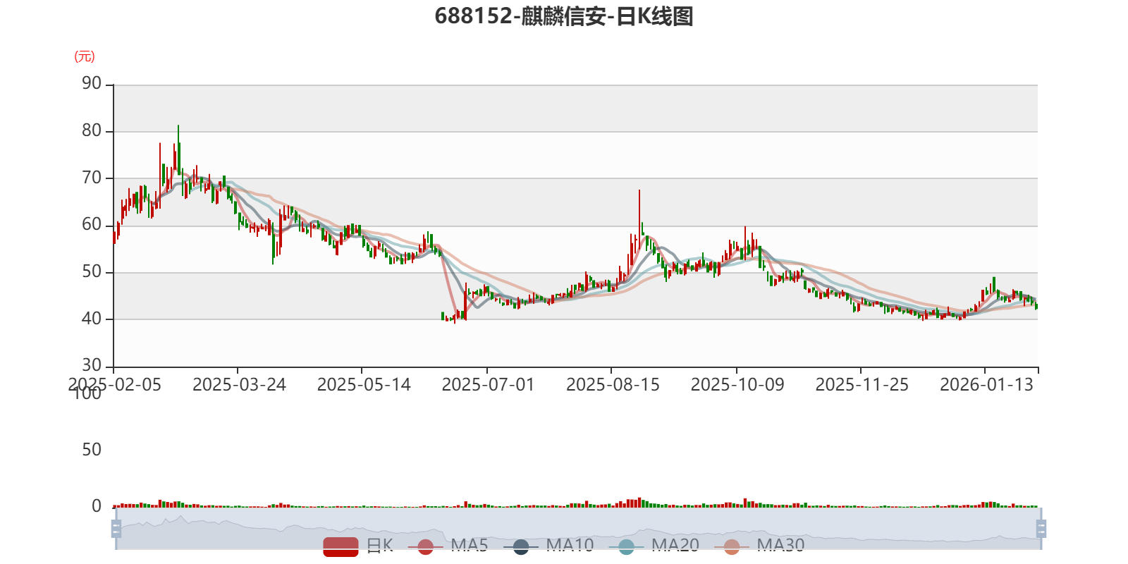 中证智能财讯麒麟信安(688152)1月30日晚间披露2025年度业绩预告,预计2025年实现营业收入3.1亿元,同比增长8.25%;归母净利润亏损5700万元,上年同期盈利793.57万元;扣非净利润亏损8900万元,上年同期亏损1673.68万元。以1月30日收盘价计算,麒麟信安目前市盈率(TTM)约为-76.49倍,市净率(LF)约3.44倍,市销率(TTM)约14.06倍。