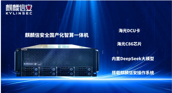 麒麟信安全国产化智算一体机内置DeepSeek大模型,搭载麒麟信安操作系统,并以海光C86芯片+海光DCU卡强力加持