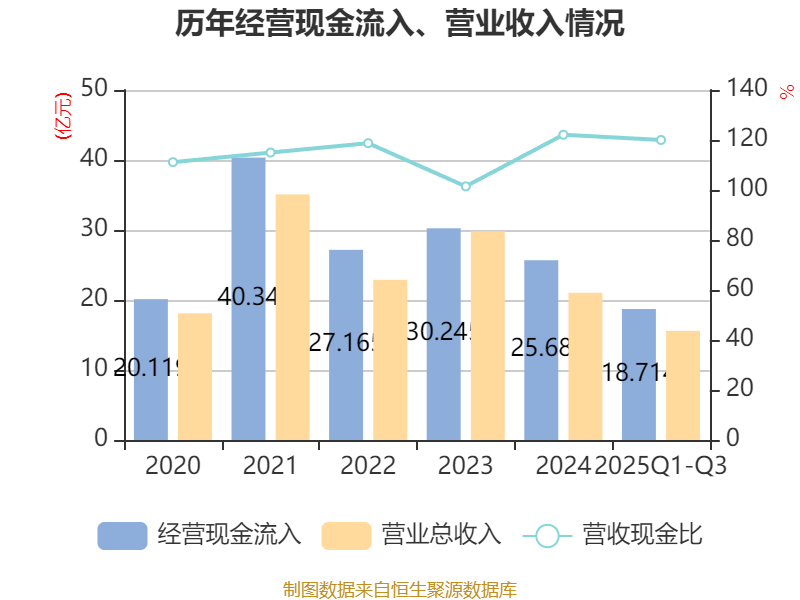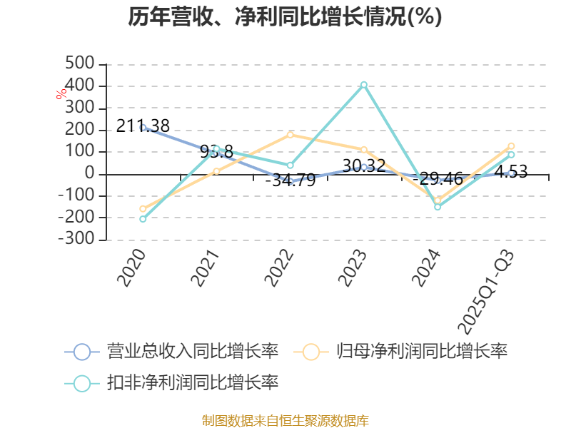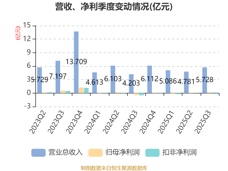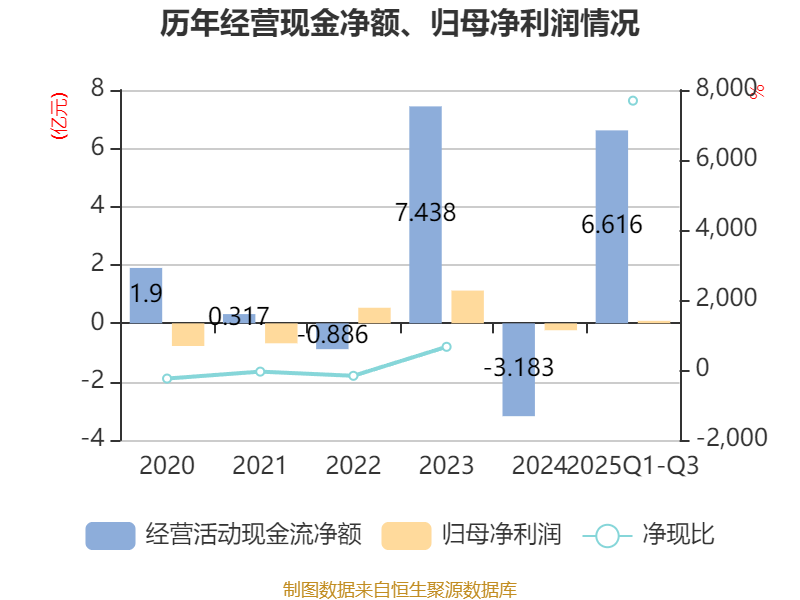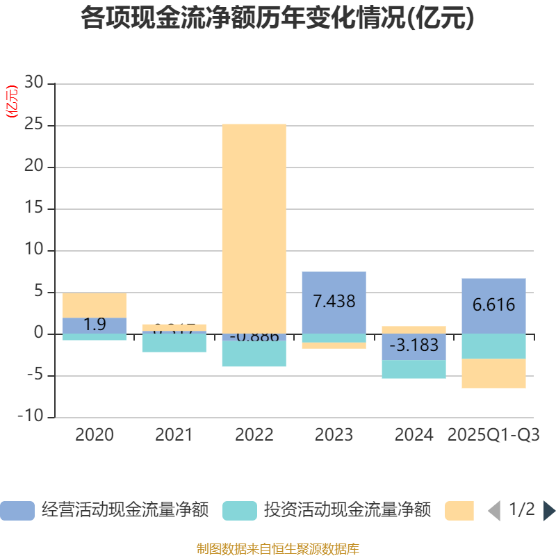 2025年前三季度,公司经营活动现金流净额为6.62亿元,同比增加10亿元;筹资活动现金流净额-3.51亿元,同比减少3.23亿元;投资活动现金流净额-3.03亿元,上年同期为-8626.02万元。