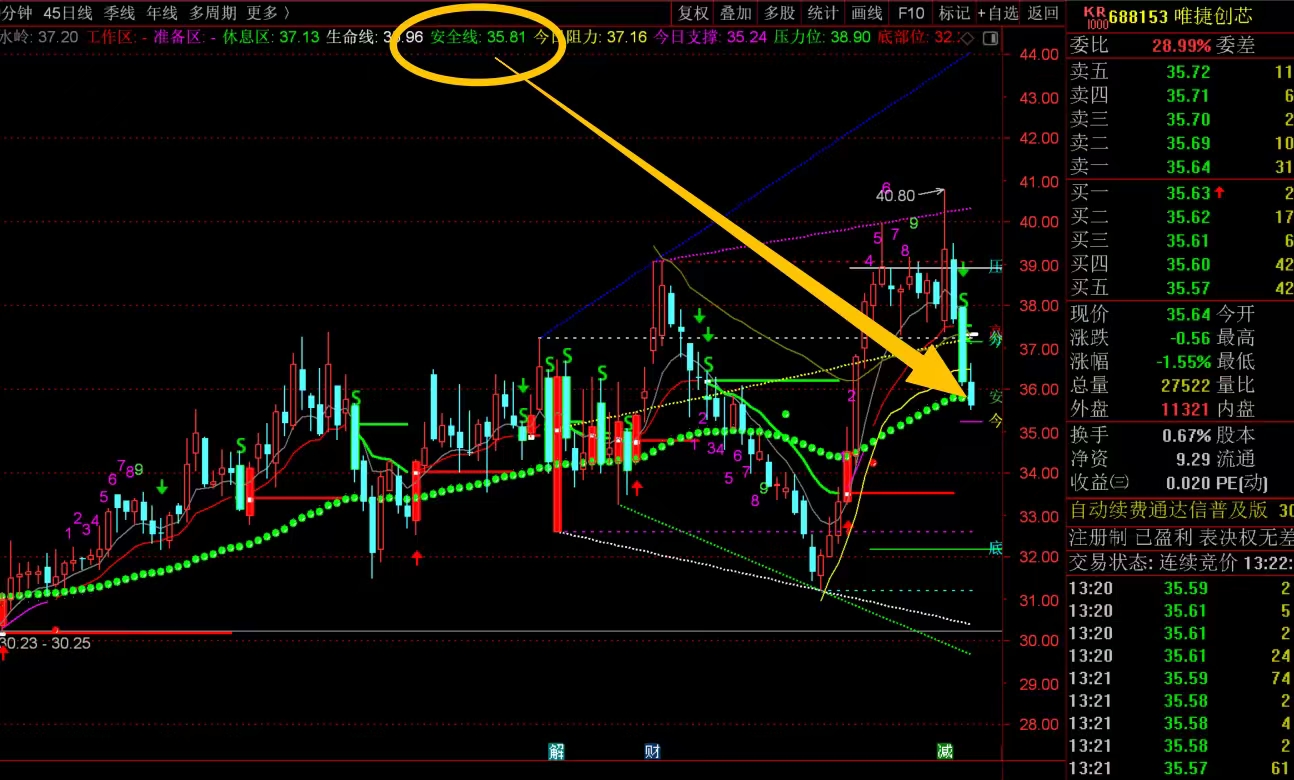 $唯捷创芯(SH688153)$ 近期走势比较狂野,上下振幅比较大,短线来看,这里连续回落到了安全线35.81位置附近,重点观察其得失,能稳住问题就不大,但有效跌破就要注意回落风险了,需要控制仓位应对,谨慎抄底。#复盘记录# #炒股日记#
