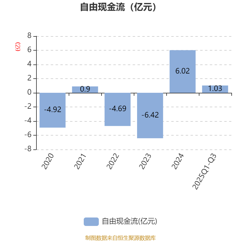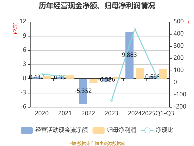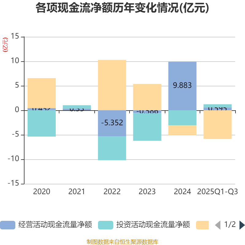 2025年前三季度,公司经营活动现金流净额为5949.42万元,同比下降91.06%;筹资活动现金流净额-5.84亿元,同比减少4.38亿元;投资活动现金流净额6249.91万元,上年同期为-3.84亿元。