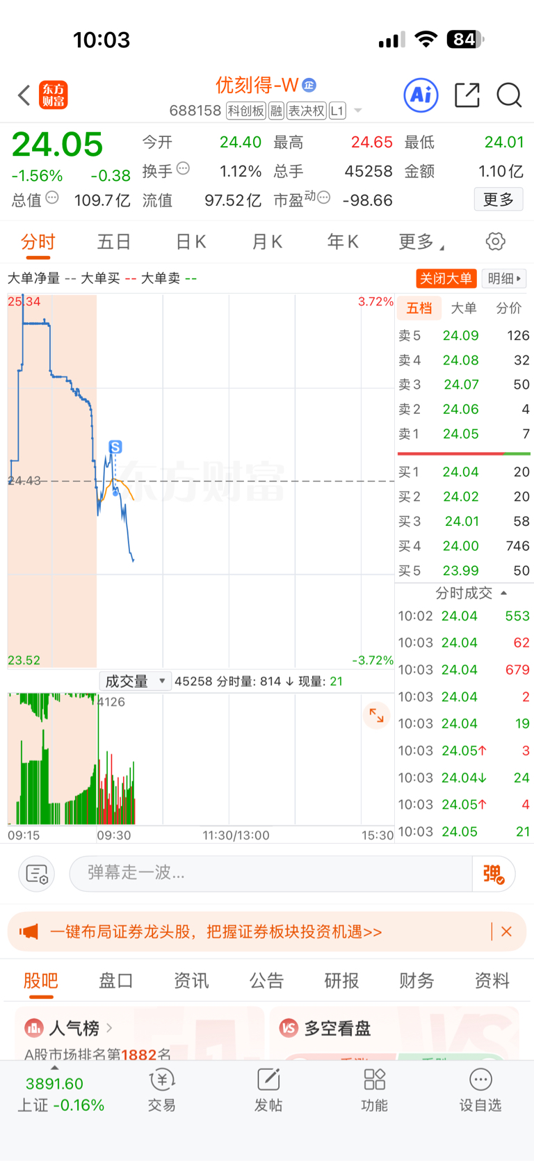 $优刻得-W(SH688158)$ 早上本来还好好的,回不去了。庄家看方向不对,赶紧调头猛砸,我都清楚他们套路了,提前卖了七成仓位