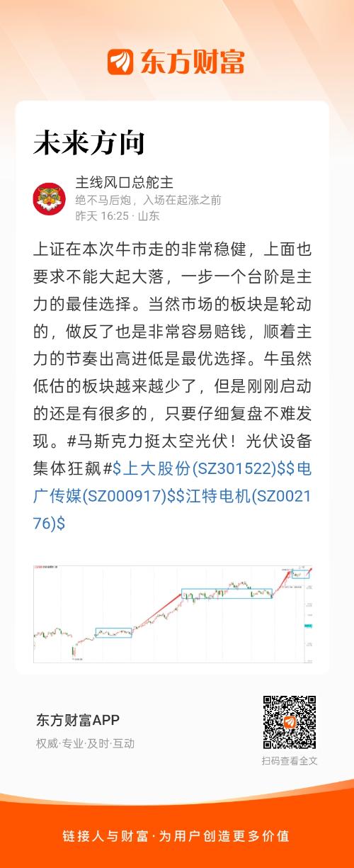 上证在本次牛市走的非常稳健,上面也要求不能大起大落,一步一个台阶是主力的最佳选择。当然市场的板块是轮动的,做反了也是非常容易赔钱,顺着主力的节奏出高进低是最优选择。牛虽然低估的板块越来越少了,但是刚刚启动的还是有很多的,只要仔细复盘不难发现。#马斯克力挺太空光伏!光伏设备集体狂飙#$上大股份(SZ301522)$$电广传媒(SZ000917)$$江特电机(SZ002176)$