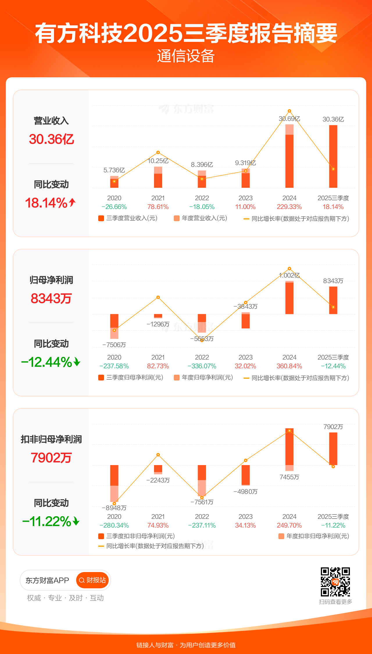 有方科技10月30日发布2025年三季报显示,公司前三季实现营业收入30.36亿元,同比增长18.14%;归母净利润8342.55万元,同比下滑12.44%;扣非归母净利润7901.97万元,同比下滑11.22%。