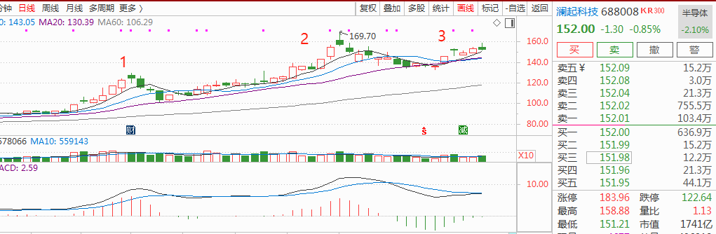 盘后出了两个重大利好,一个是业绩方面的,一个是上调回购价格。澜起科技主要做的是云计算和人工智能领域的芯片,专门提供那种性能强、耗电少的解决方案。它有内存接口芯片、内存模组配套芯片,其中在前者在国内处于领先地位。刚公布三季度业绩,营收高达14.24亿,同比增长57.22%;净利4.73亿,同比增长22.94%。前三季度也同样亮眼,营收为40.58亿,同比增长57.83%;净利为16.32亿,同比增长66.89%,现在整个存储芯片行业都在涨价,三星电子、SK 海力士这些主要的内存供应商,都计划第四季度继续上调报价,整个行业都进入了超级周期。但涨价还不是最重要的,只是跟业绩增长贴合,能刺激走出第三加速浪的动能可能来自于回购题材。盘后公告称,公司决定将2025年第二次回购股份方案回购价格上限由不超过117.80/股调整为不超过200元/股,目前股价是152,离上限还有31个点的空间,前面做过的大洋电机、三花智控就是先例。