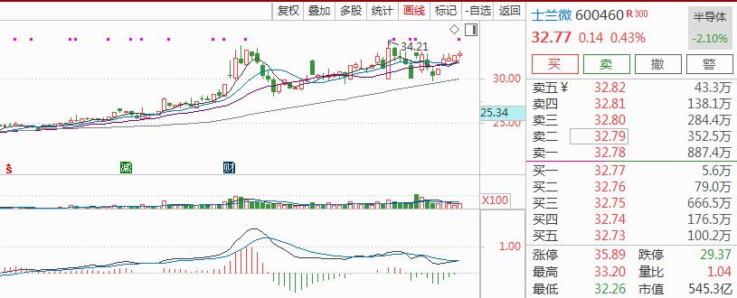 士兰微最值得关注的就是业绩暴涨和订单爆满,它是国内少见的 IDM 模式半导体企业,从芯片设计、制造到封装全链条自己把控,还被国家部委认定为 “国家规划布局内重点软件和集成电路设计企业”,承担过国家科技重大专项课题。盘后消息,第三季度营收33.77亿,同比涨 16.88%,净利润8426.77 万,同比涨 56.62%;前三季度营收97.13 亿,同比涨 18.98%,净利润 3.49 亿,同比暴涨 1108.74%。业绩大增主要靠推出有竞争力的产品,发力白电、汽车、新能源等高端市场;二是子公司 5、6、8 英寸芯片产线和参股企业12英寸产线都满负荷生产。展望四季度,子公司士兰明镓 6 英寸 SiC 功率器件芯片产线产出也会明显增加,预计营收还能接着涨。一直都是走得不急不慢的,今天有可能走加速,周线上阴多阳少,但是股价不但没有下行还稳步上行,这应该是个震荡的过程,今天若能突围34.20压力点则有望跳出整理区。