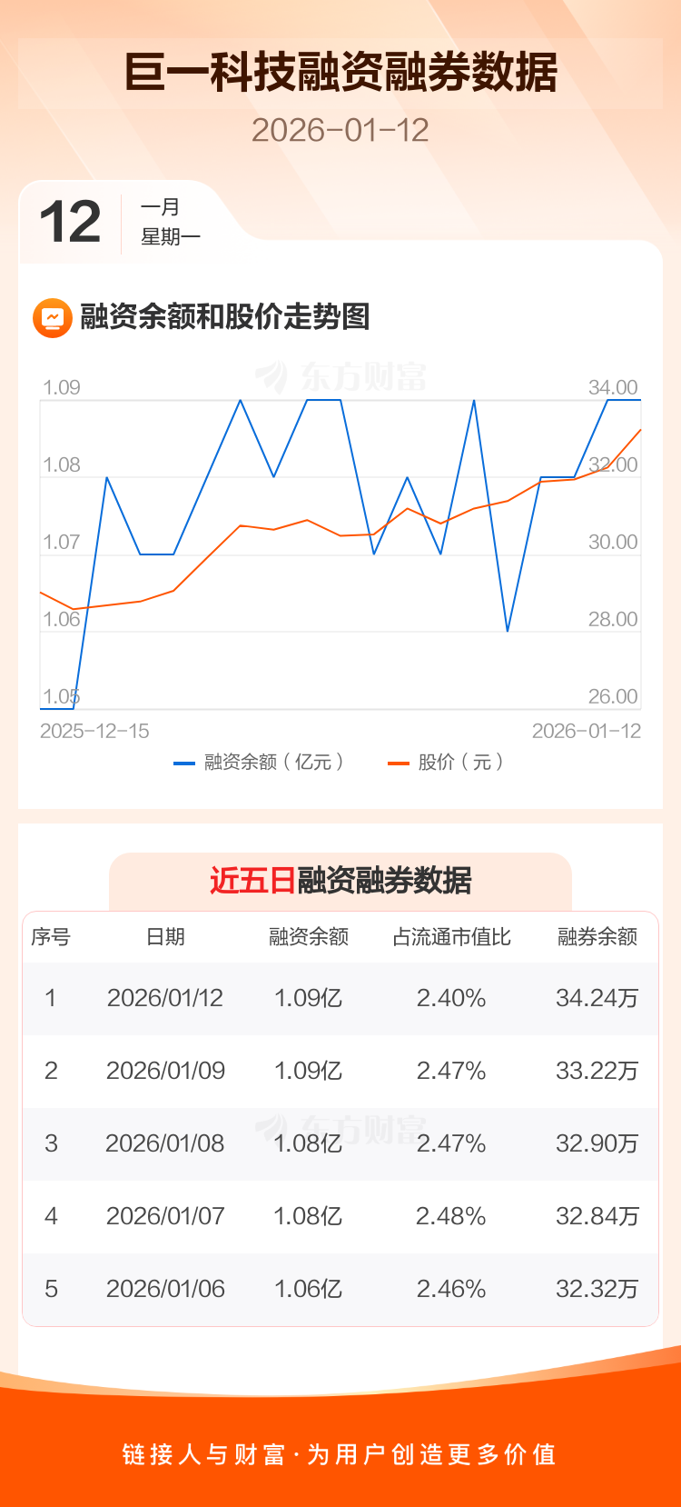 交易所最新数据显示,巨一科技于2026年1月12日获融资买入1427.41万元,融资偿还1414.90万元,当日融资净买入12.5万元。目前,该股融资余额1.09亿,占流通市值比例为2.40%。