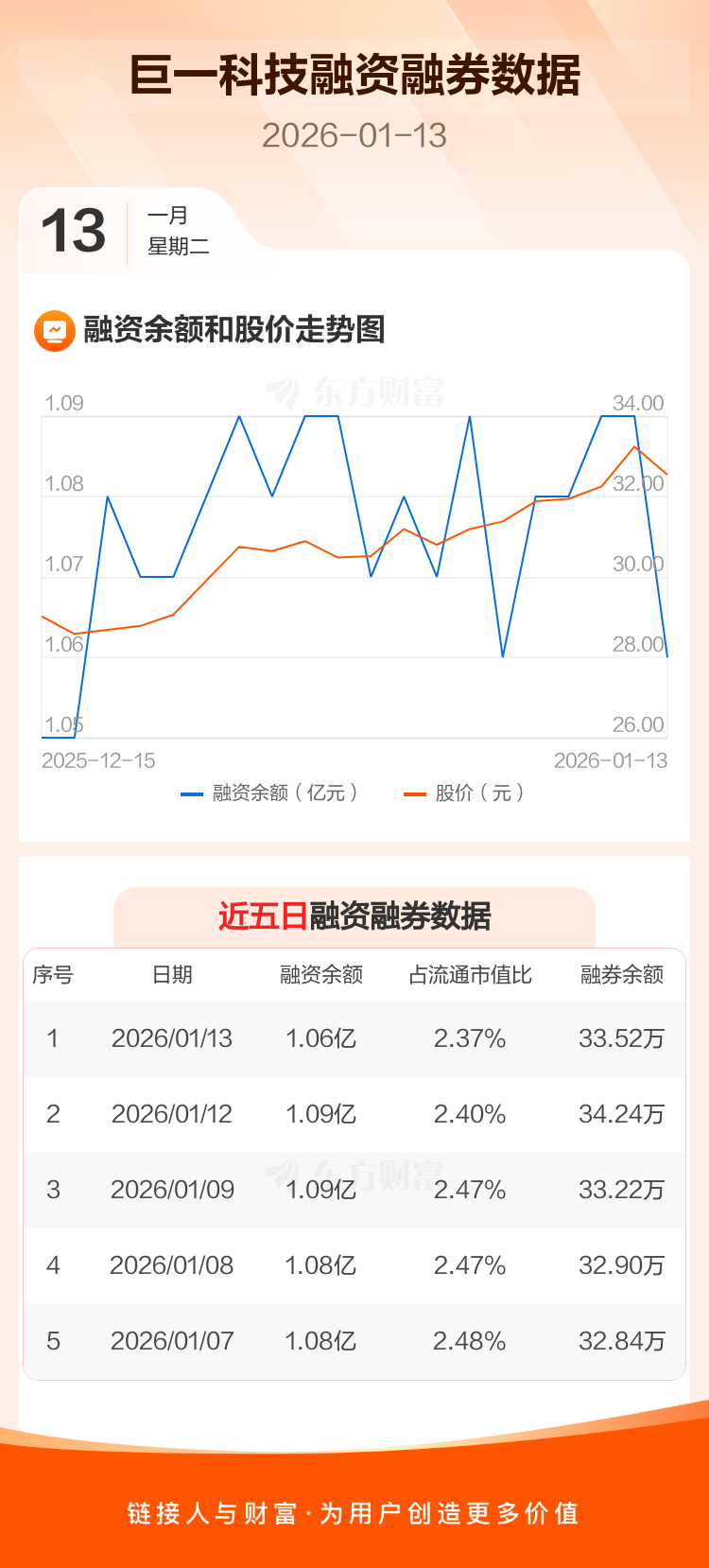 交易所最新数据显示,巨一科技于2026年1月13日获融资买入1010.60万元,融资偿还1340.30万元,当日融资净偿还329.7万元。目前,该股融资余额1.06亿,占流通市值比例为2.37%。