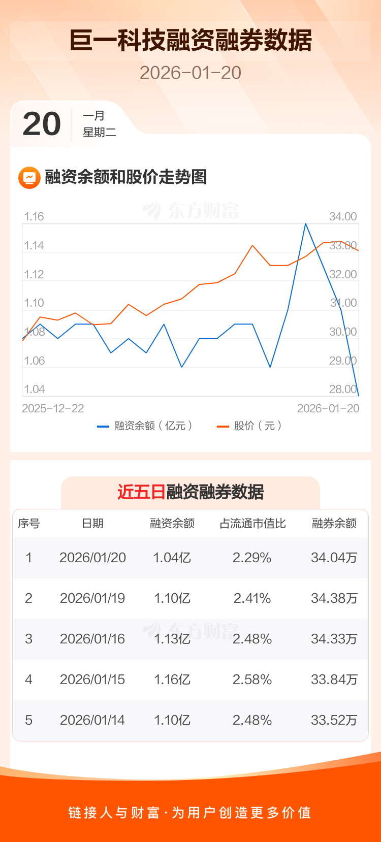 交易所最新数据显示,巨一科技于2026年1月20日获融资买入683.50万元,融资偿还1367.00万元,当日融资净偿还683.5万元。目前,该股融资余额1.04亿,占流通市值比例为2.29%。
