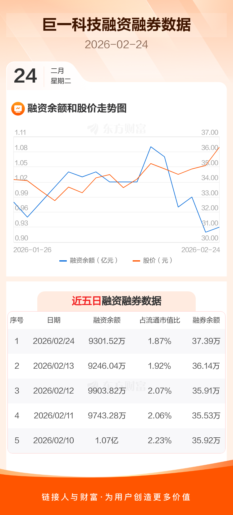交易所最新数据显示,巨一科技于2026年2月24日获融资买入974.76万元,融资偿还919.28万元,当日融资净买入55.48万元。目前,该股融资余额9301.52万,占流通市值比例为1.87%。