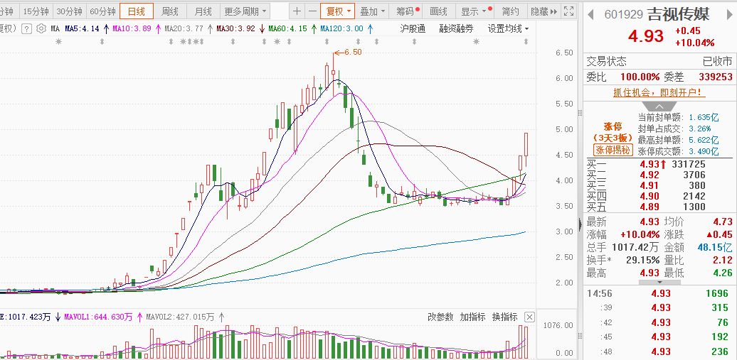 吉视传媒:大消费,今天平开,市场弱势,开盘后快速回踩,随后快速V上来,反弹上来破了开盘价站上分时图均价线,果断B了点,随后直线拉升冲到8%左右,震荡后尾盘涨停,封单1.6个多亿,实现三连板,上涨趋势继续延续,目前处于拉升初期,和我们预期的一样,前高压力6.5附近去了空间足够。