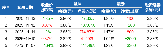埃夫特:融资净偿还17.33万元,融资余额3.8亿元(11-13)