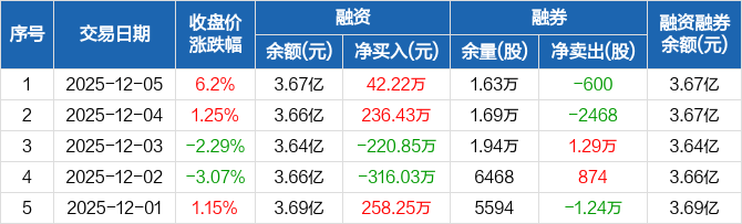 埃夫特:融资净买入42.22万元,融资余额3.67亿元(12-05)