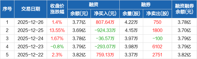 埃夫特:融资净买入807.64万元,融资余额3.77亿元(12-26)