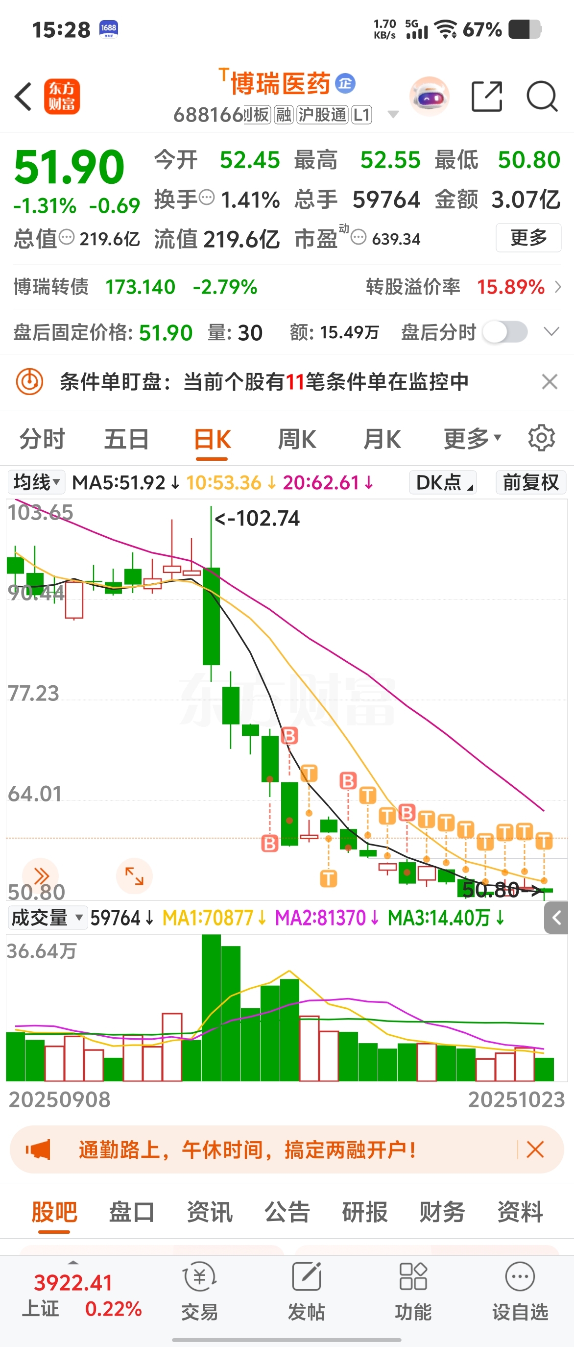 $博瑞医药(SH688166)$ 高套一起下来的战友们,还有多少人在?希望今天是一根探底的线。