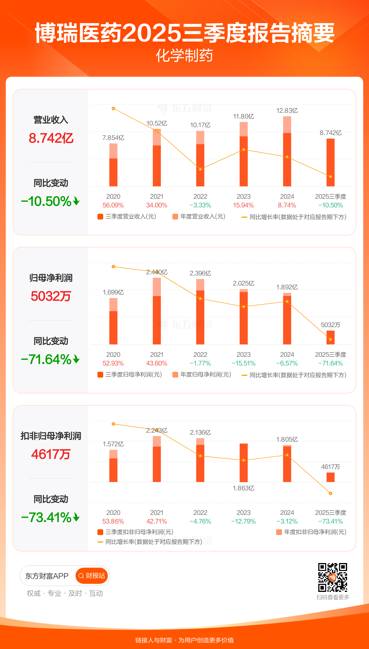 博瑞医药10月31日发布2025年三季报显示,公司前三季实现营业收入8.74亿元,同比下滑10.50%;归母净利润5032.00万元,同比下滑71.64%;扣非归母净利润4617.23万元,同比下滑73.41%。