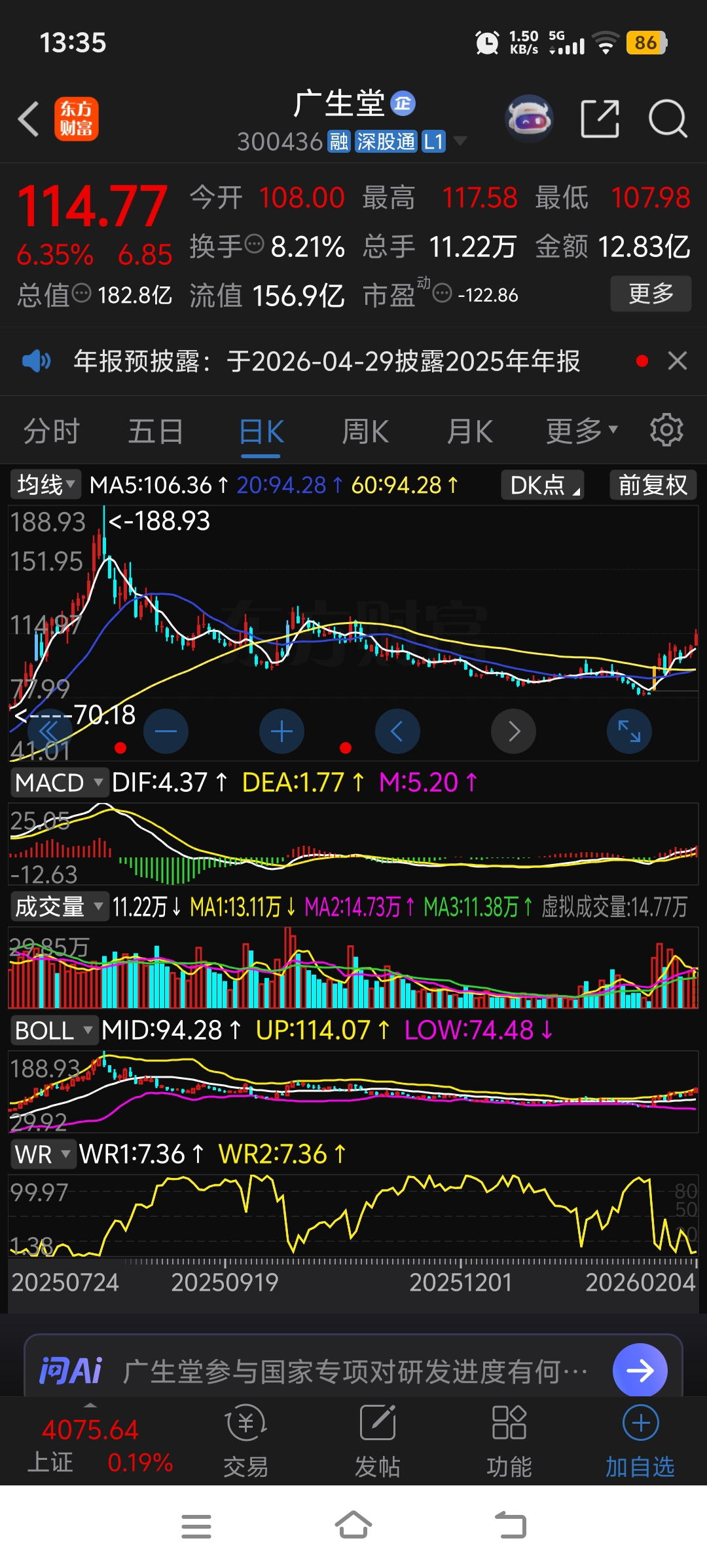 看看广生堂,底部79元起来,反弹117-79=38/79=48%+。