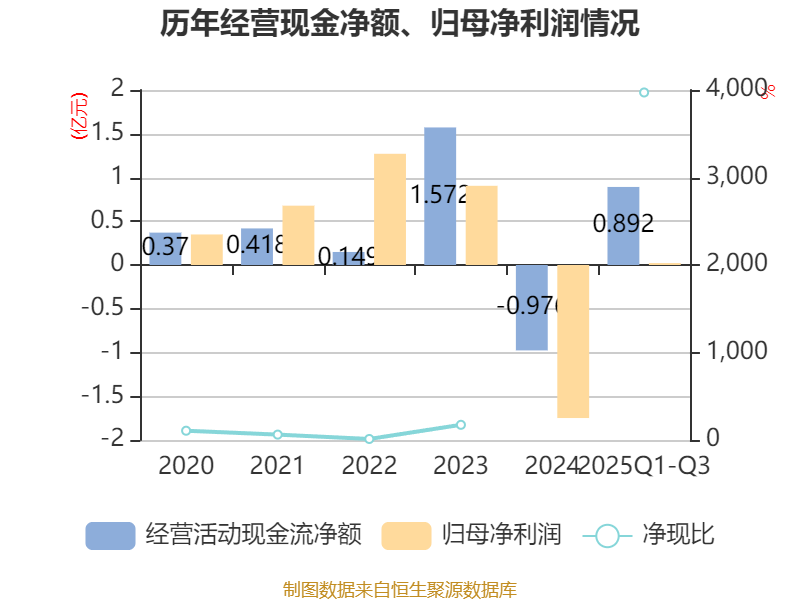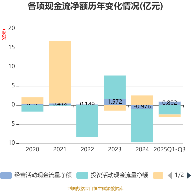 2025年前三季度,公司经营活动现金流净额为8921.94万元,同比增加1.12亿元;筹资活动现金流净额-6829.08万元,同比减少3.29亿元;投资活动现金流净额-2.47亿元,上年同期为-8.95亿元。