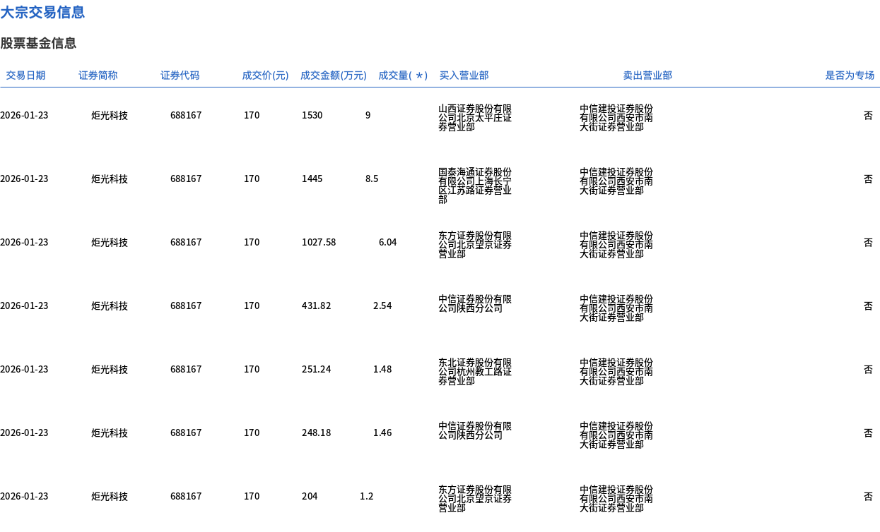 炬光科技今日大宗交易折价成交30.22万股,成交额5137.82万元