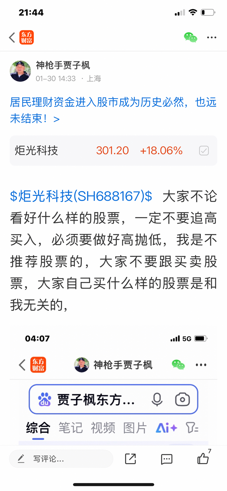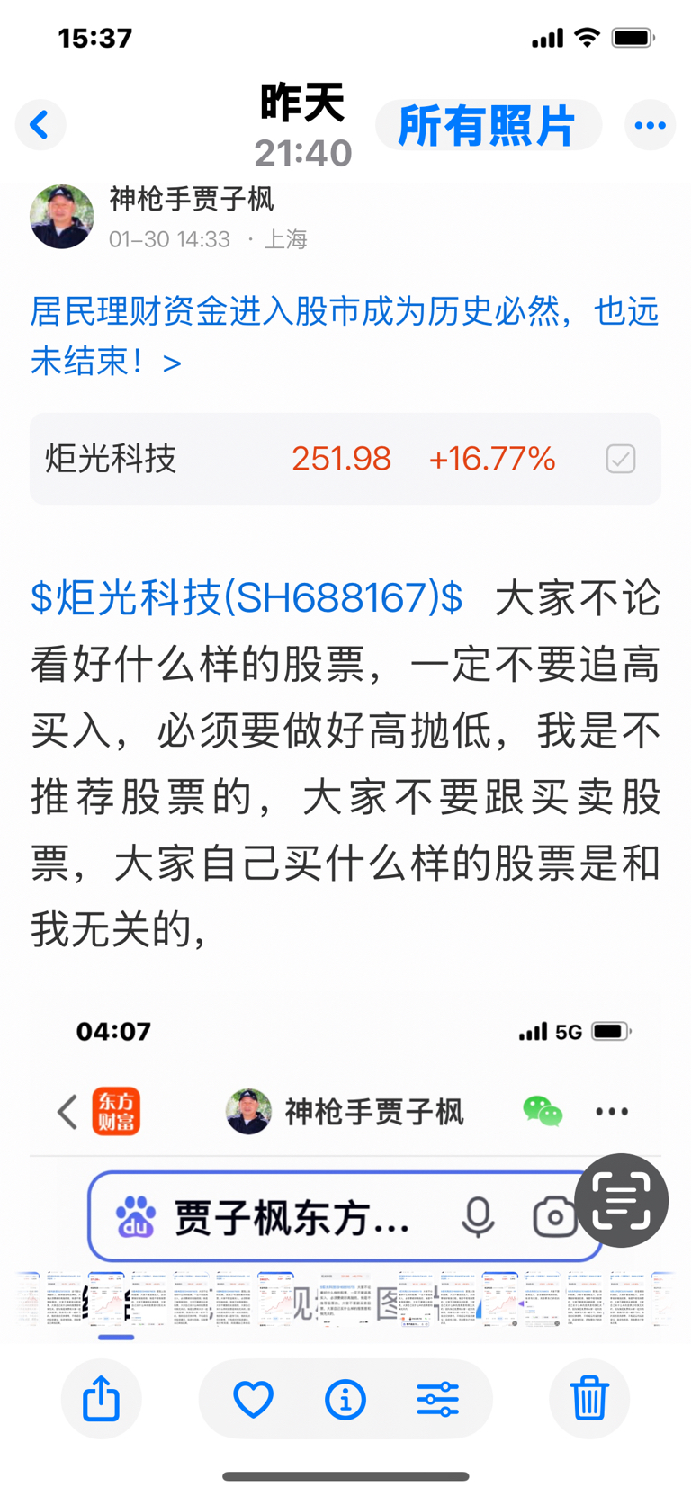 $炬光科技(SH688167)$ 这个股我是一月三十号发表文章看涨的股票,大家不要追高买入,必须要做好高抛低吸,我是不推荐股票的,大家不要跟我买卖股票,大家自己买什么样的股票是和我无关的,因为我是免费和大家一起交流股票,我是和大家一起学习的,我的观点仅供参考,投资有风险,风险要自己承担后果,