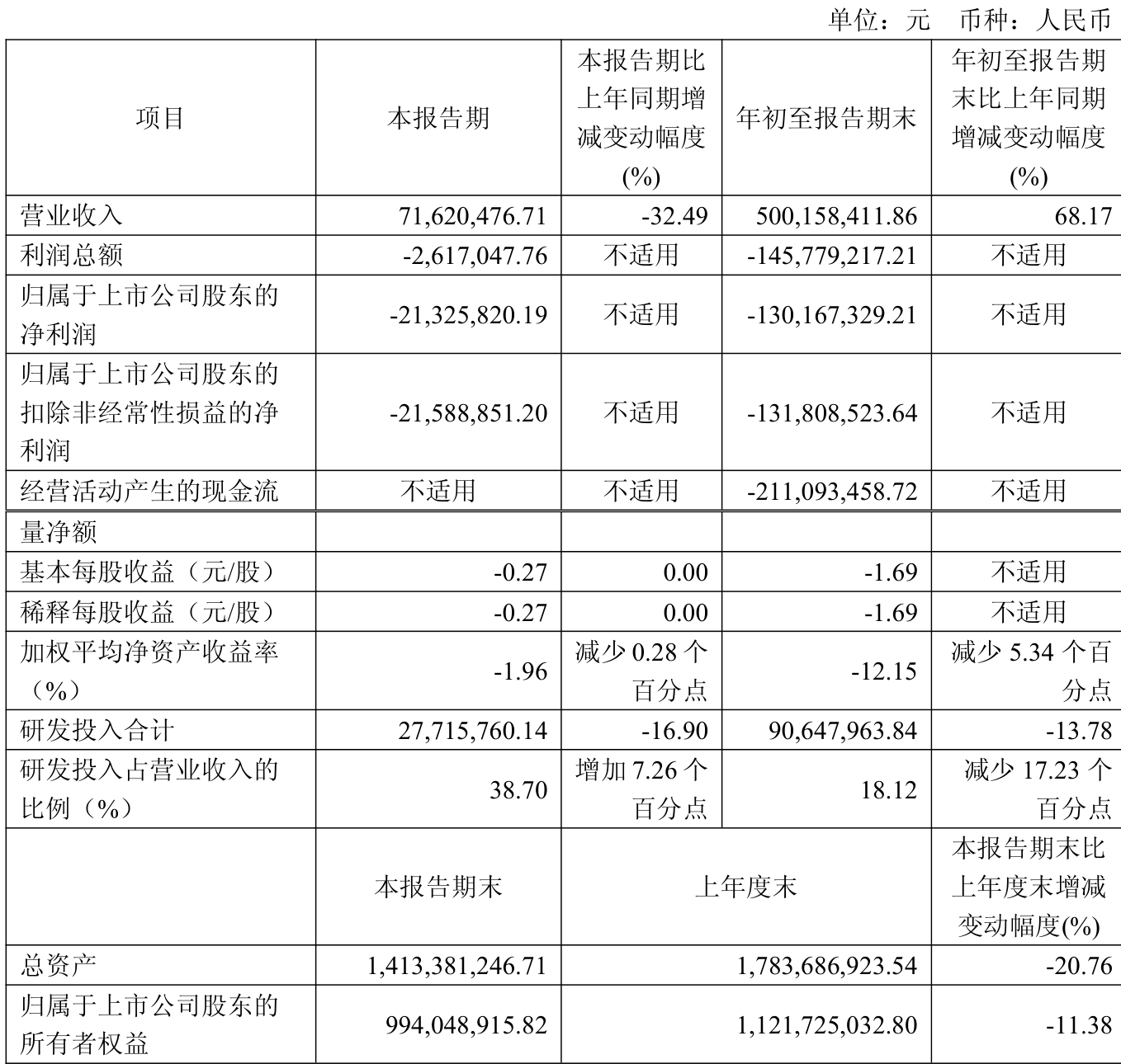 中证智能财讯安博通(688168)10月28日披露2025年第三季度报告。前三季度公司实现营业总收入5亿元,同比增长68.17%;归母净利润亏损1.3亿元,上年同期亏损8153.33万元;扣非净利润亏损1.32亿元,上年同期亏损8410.47万元;经营活动产生的现金流量净额为-2.11亿元,上年同期为-2.21亿元;报告期内,安博通基本每股收益为-1.69元,加权平均净资产收益率为-12.15%。