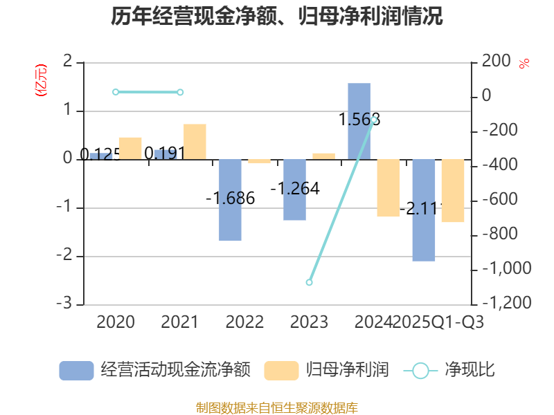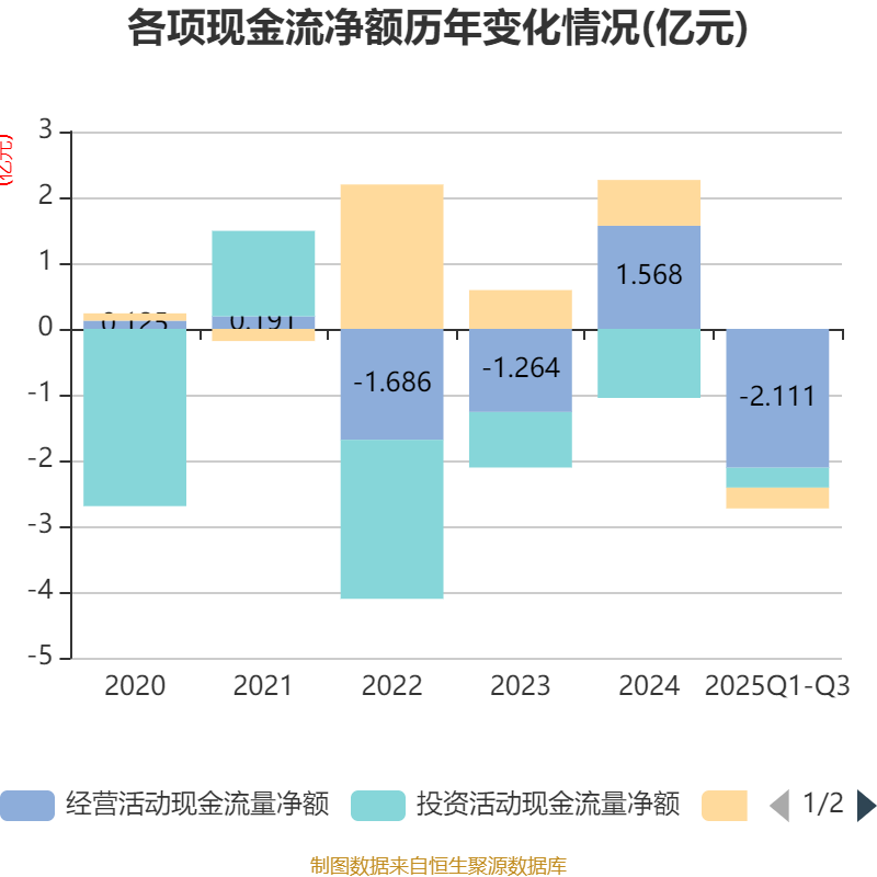 2025年前三季度,公司经营活动现金流净额为-2.11亿元,同比增加963万元;筹资活动现金流净额-3162.25万元,同比减少7392.94万元;投资活动现金流净额-3028.28万元,上年同期为-1949.62万元。