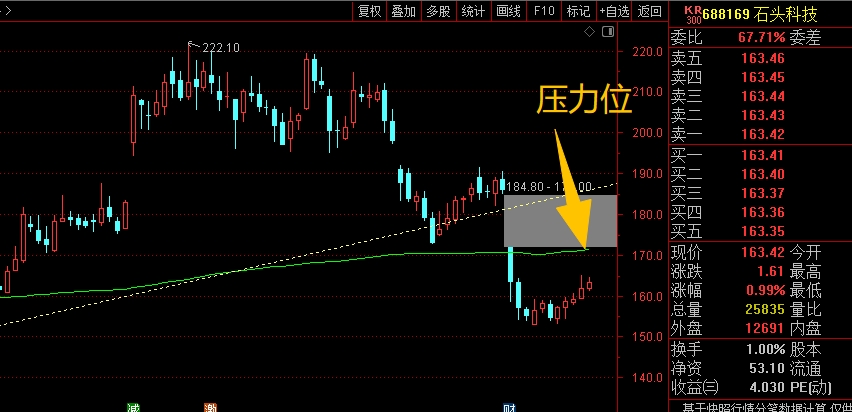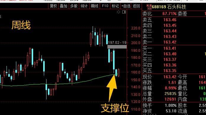 $石头科技(SH688169)$ 近期趋势走得比较弱,特别是前期冲高回落后,没有像样的反弹,逐步回落调整到现在,接下来没有站稳日线大均线171.33之前,暂时不考虑介入,同时周线上要注意脚底大均线157.37位置的支撑,能稳住就还能继续观察,有效跌破中期趋势就变弱了。