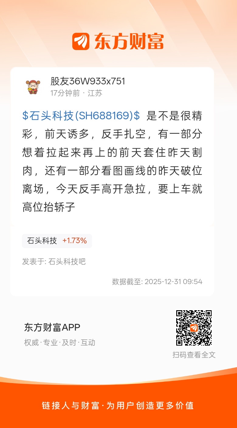 $石头科技(SH688169)$ 是不是很精彩,前天诱多,反手扎空,有一部分想着拉起来再上的前天套住昨天割肉,还有一部分看图画线的昨天破位离场,今天反手高开急拉,要上车就高位抬轿子
