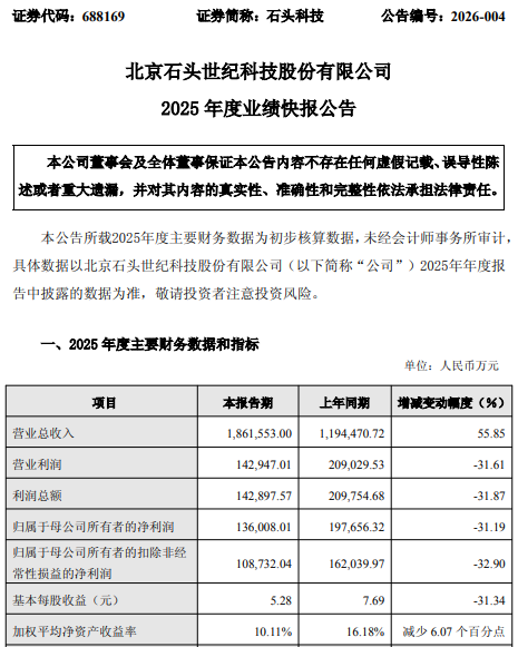 2月27日盘后,扫地机器人龙头石头科技(688169)发布2025年度业绩快报。快报显示,公司实现营业总收入186.16亿元,同比增长55.85%;归母净利润13.6亿元,同比下降31.19%。