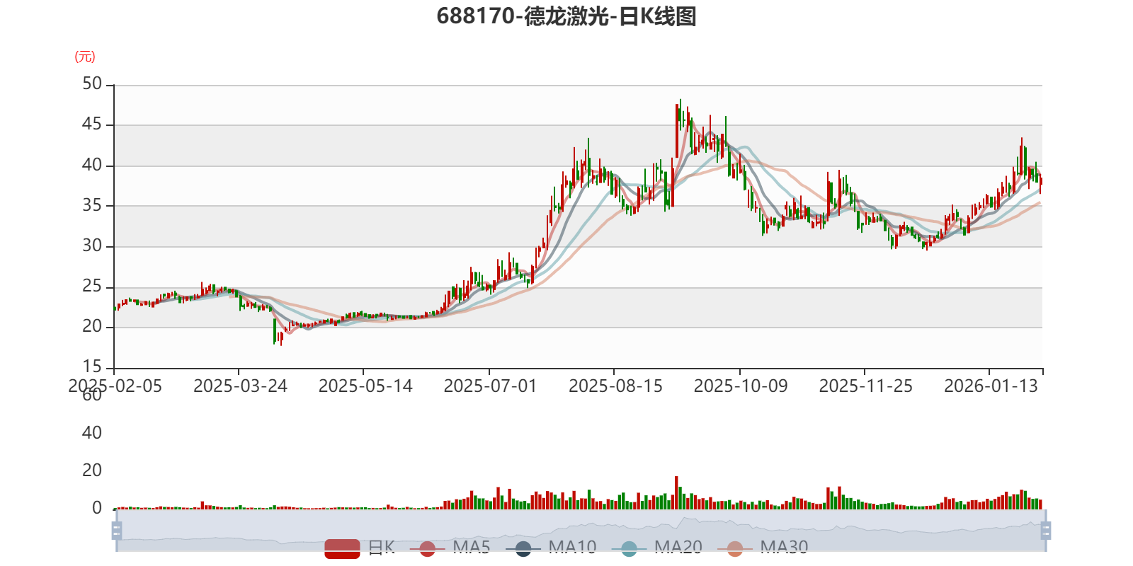 中证智能财讯德龙激光(688170)1月30日晚间披露2025年度业绩预告,预计2025年归母净利润2100万元至3000万元,上年同期亏损3450.11万元;扣非净利润预计500万元至750万元,上年同期亏损5149.53万元。以1月30日收盘价计算,德龙激光目前市盈率(TTM)约为132.47倍-189.25倍,市净率(LF)约3.27倍,市销率(TTM)约5.3倍。