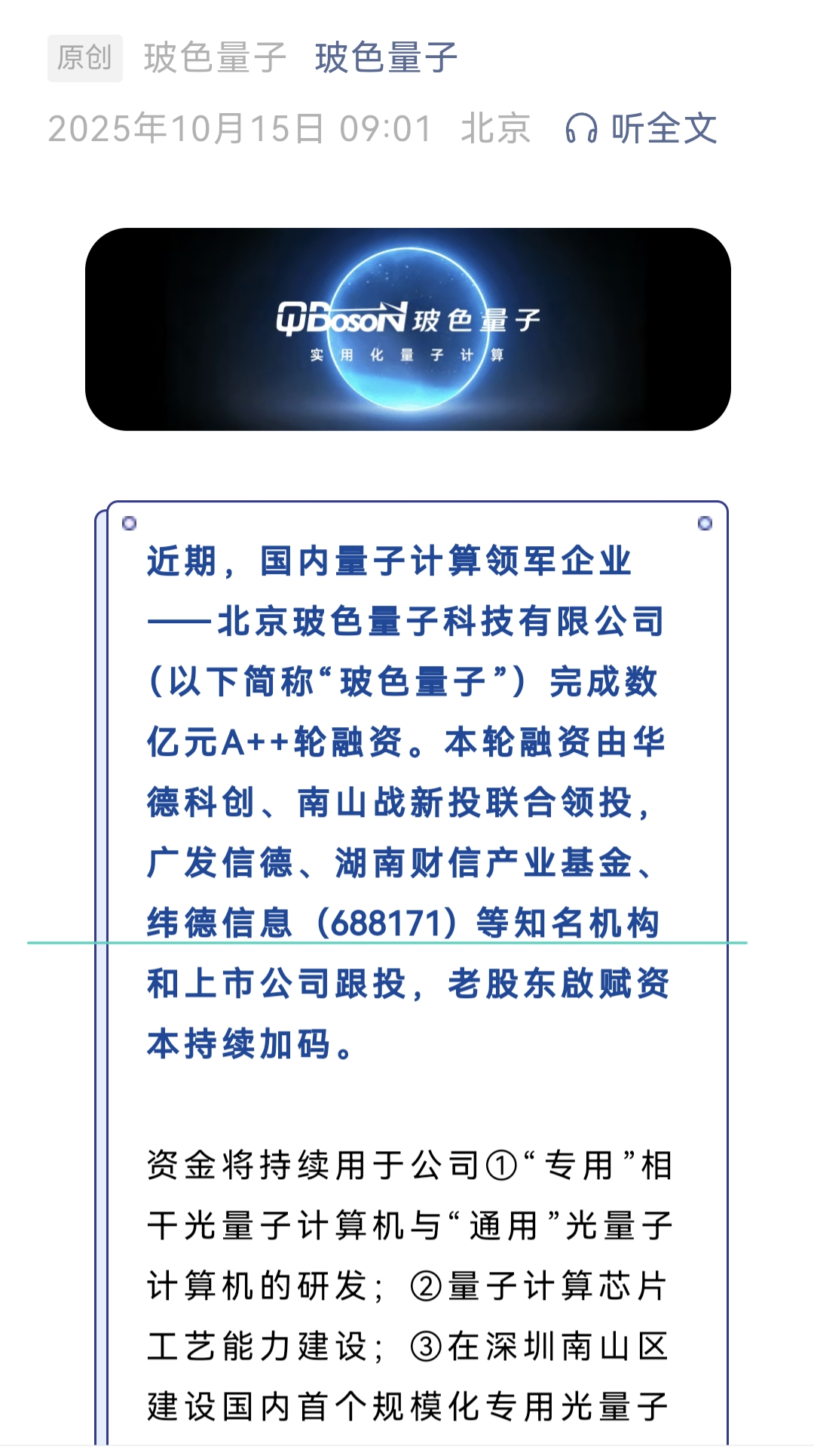 纬德信息投资光量子计算机领军企业玻色量子
