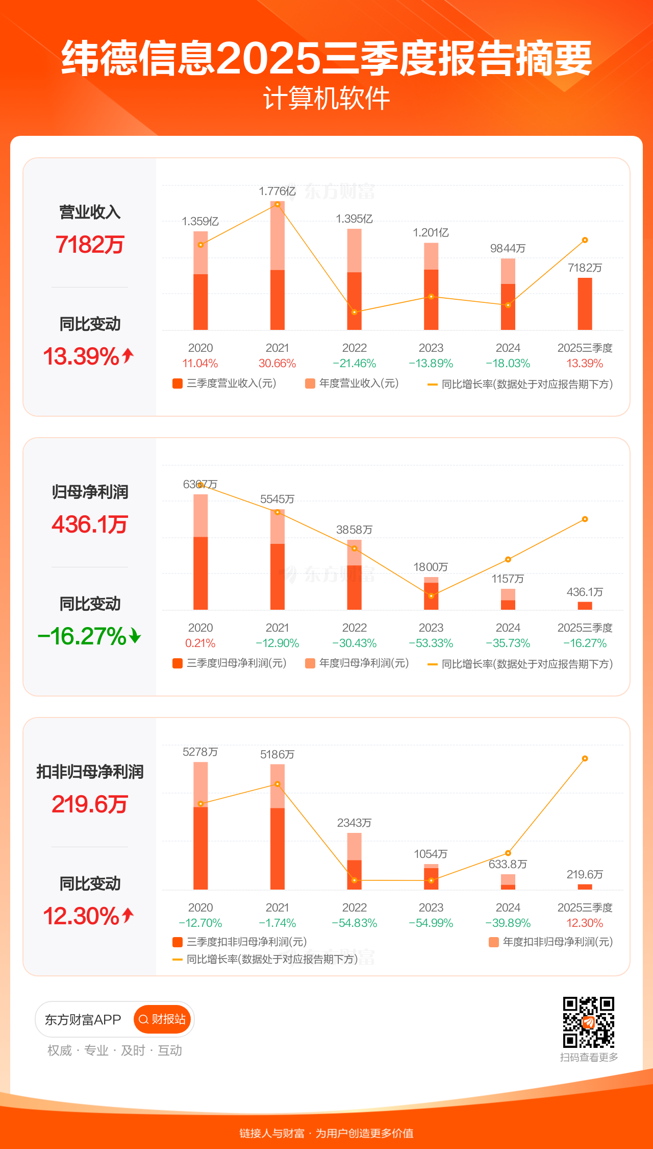 纬德信息10月31日发布2025年三季报显示,公司前三季实现营业收入7182.05万元,同比增长13.39%;归母净利润436.13万元,同比下滑16.27%;扣非归母净利润219.56万元,同比增长12.30%。