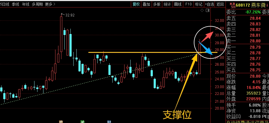 $燕东微(SH688172)$ 经过近期震荡回调横盘整理之后,今天大阳线拉升起来,非常漂亮,接下来主要是看脚底横线和趋势线交汇处的支撑,这里能稳住就还可以震荡看涨,继续拿捏,但回落有效跌破就偏弱了,短线走回调震荡,需要控制仓位应对。