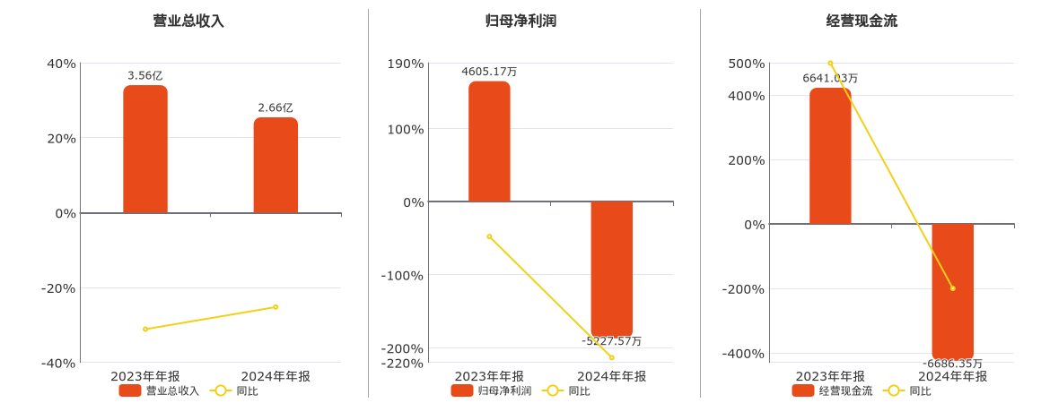 公司营业总收入为2.66亿元,较去年同报告期营业总收入减少8991.57万元,同比较去年同期下降25.23%。归母净利润为-5227.57万元,较去年同报告期归母净利润减少9832.74万元,同比较去年同期下降213.52%。经营活动现金净流入为-6686.35万元,较去年同报告期经营活动现金净流入减少1.33亿元,同比较去年同期下降200.68%。