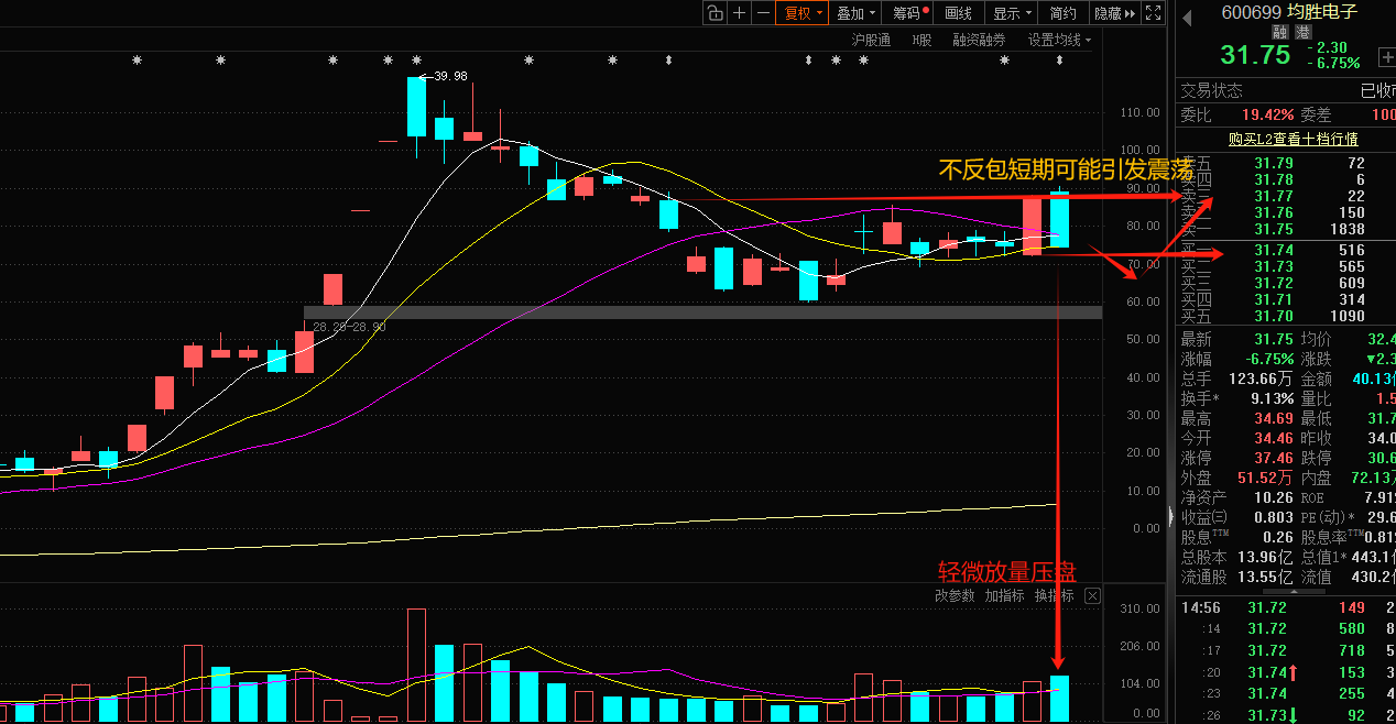均胜电子600699:智能驾驶以及机器人概念,昨天这个阴线直接就把前面的张幅给压没了,所以今天就需要反包才能保持原有趋势,否则今天是要撤离的,因为再度下沉会引发震荡。这样很耗时间吃力不讨好。
