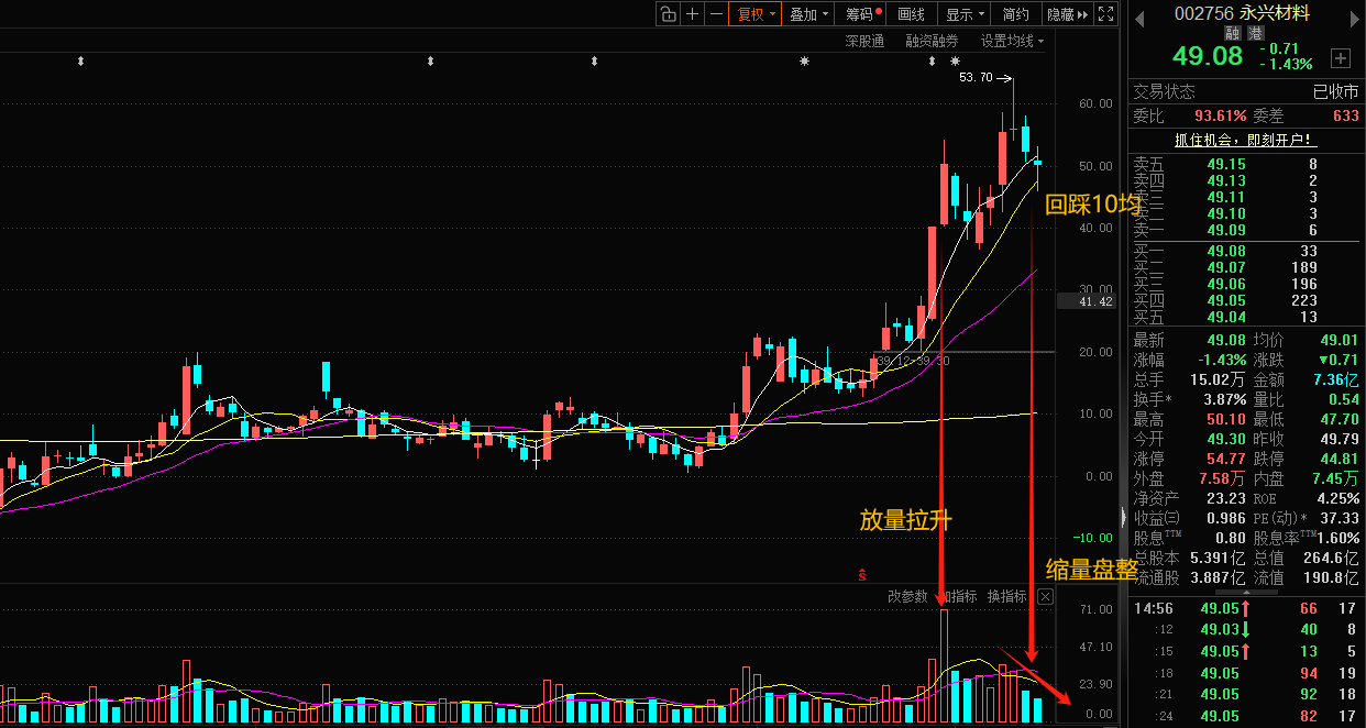 永兴材料002756:这里缩量调整又是上影又是下影的,如果今天能够强势反包的话倒是可以忽略中间当作揉搓线来看,不过短期的极限是不能破10均不收回,其他都还好。板块里天际股份都能一直向上,也不差一个补张的。