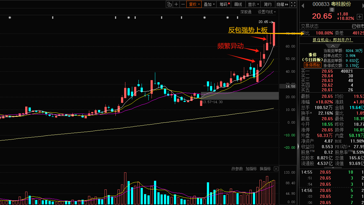 粤桂股份000833:前面一直上影线异动,回过头看,有几次实际是冲到板附近甚至碰板不封,但是每天又都蛮好,这种一般是蓄力比较久的,昨天直线上板算是很强了,所以今天大概率要加速,至少也会有哥不错的冲高才行。